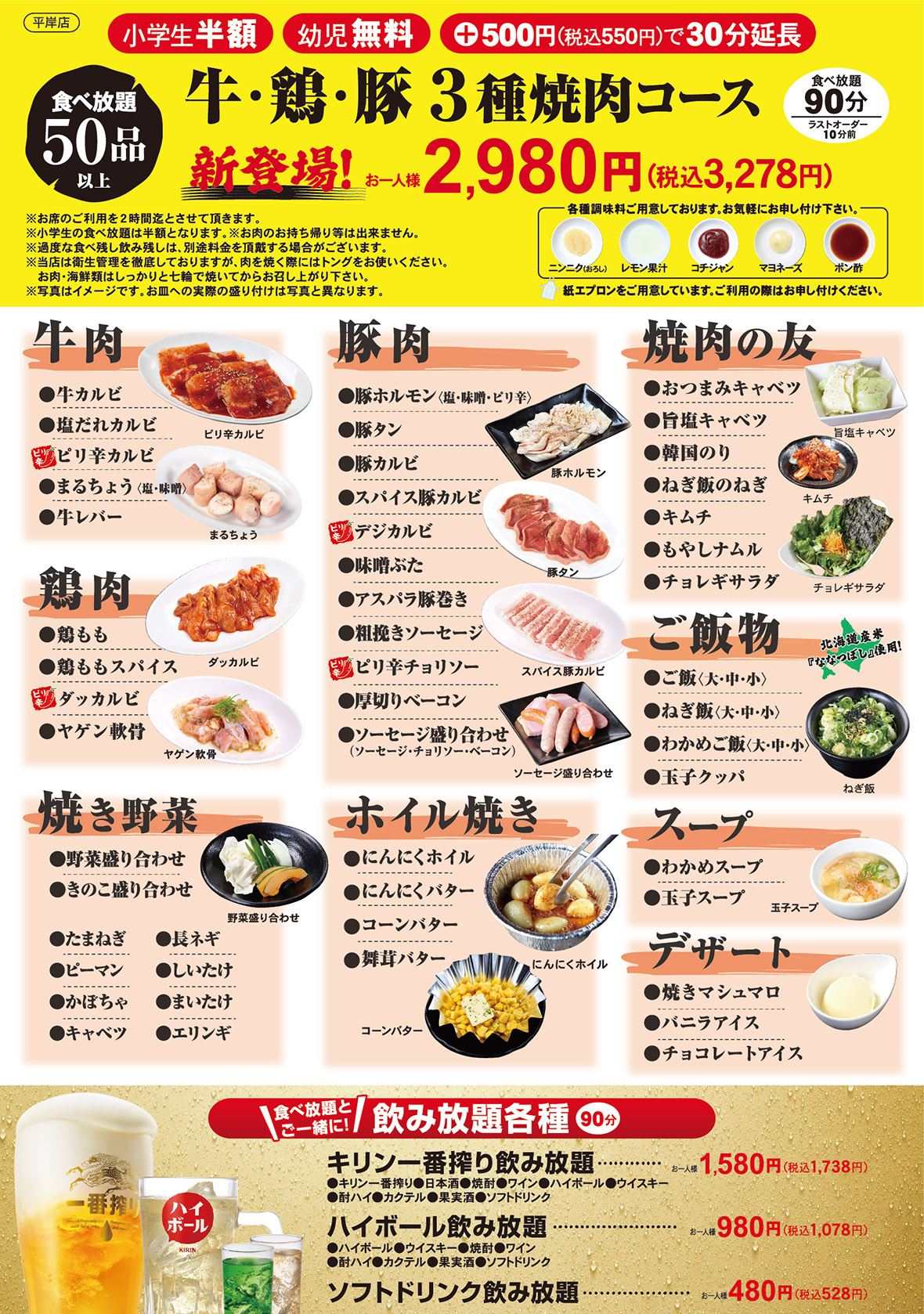 〈平岸店〉 牛・鶏・豚3種焼肉コース・90分