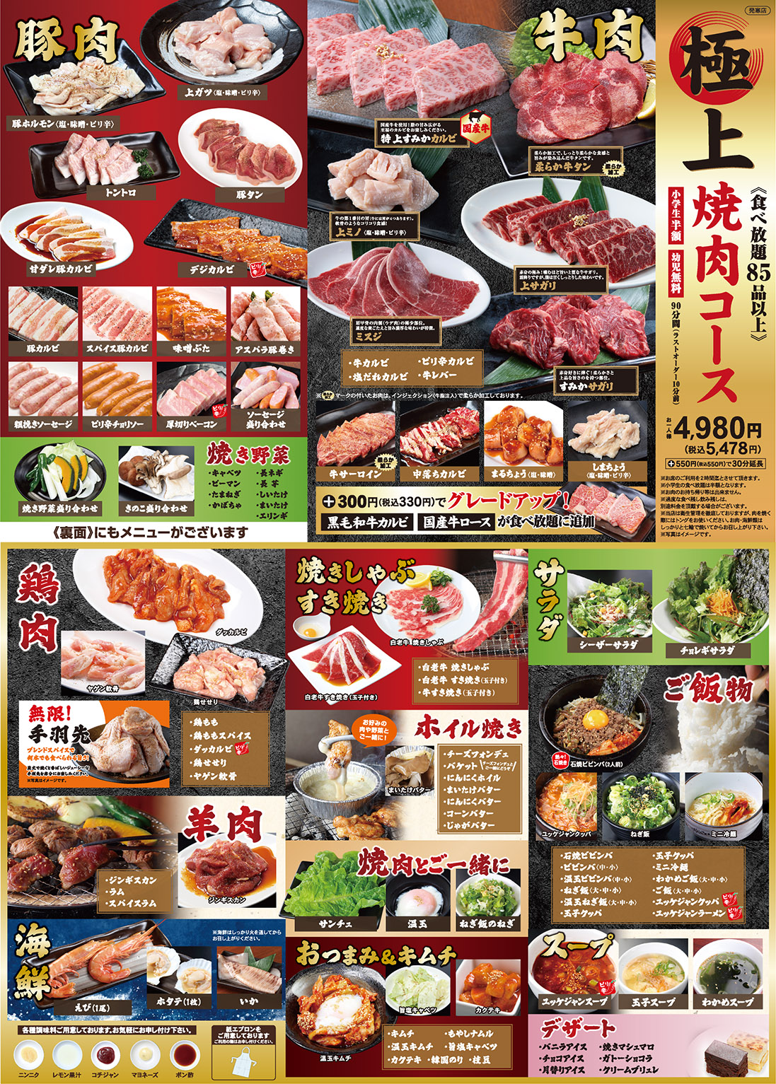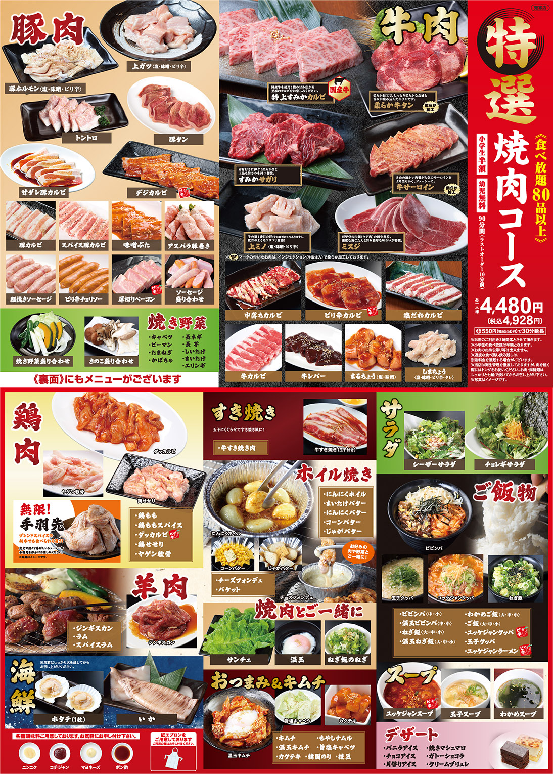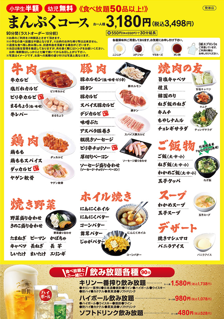 *過度の食べ残し・飲み残しの場合、別途料金を頂戴する場合がございます。*お飲み物のご注文はグラス交換制です。*飲み放題は90分、ラストオーダーは10分前となります。*お車でご来店のお客様の飲酒はお断りしております。飲酒運転や未成年者の飲酒は法律で禁止されています。